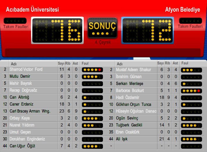 Mücadelenin ilk çeyreğini Acıbadem Üniversitesi 13-12’lik skorla üstün noktaladı. İkinci çeyrekte ağır basan taraf Afyon ekibi oldu ve Afyon Belediye soyunma odasına 33-31 önde gitti. Maçın son çeyreğine 51-51’lik eşitlikle girildi. Son çeyrekte iyi bir oyun oynayan ev sahibi maçtan 76-72 galip ayrıldı.