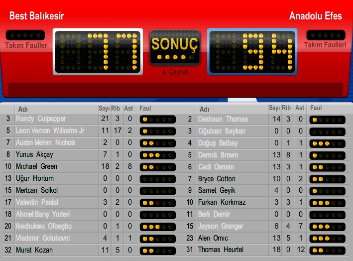Heurtel 18 sayı 12 asistle yıldızlaşırken Granger 6 sayı 4 ribaunt 7 asist 2 top çalma, Omic 13 sayı 5 ribaunt, Brown 13 sayı 8 ribauntla oynadı.