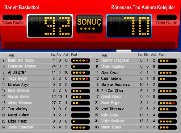Bu sezon 14. yenilgisini alan Ted Kolejliler'de ise Lucas 15 sayı, Sanikidze de 13 sayı ile öne çıktı. Başkent ekibi son 7 deplasman maçında 6 yenilgi aldı.