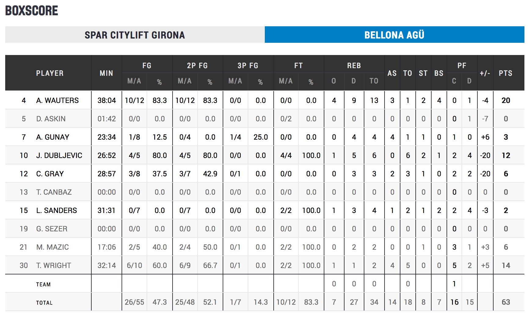 Spar Citylift Girona’da Ibekwe 21 sayı 9 ribaunt 4 asist ve Alminaite 15 sayı 11 ribaunt ile takımları adına öne çıkan isimler oldular.
