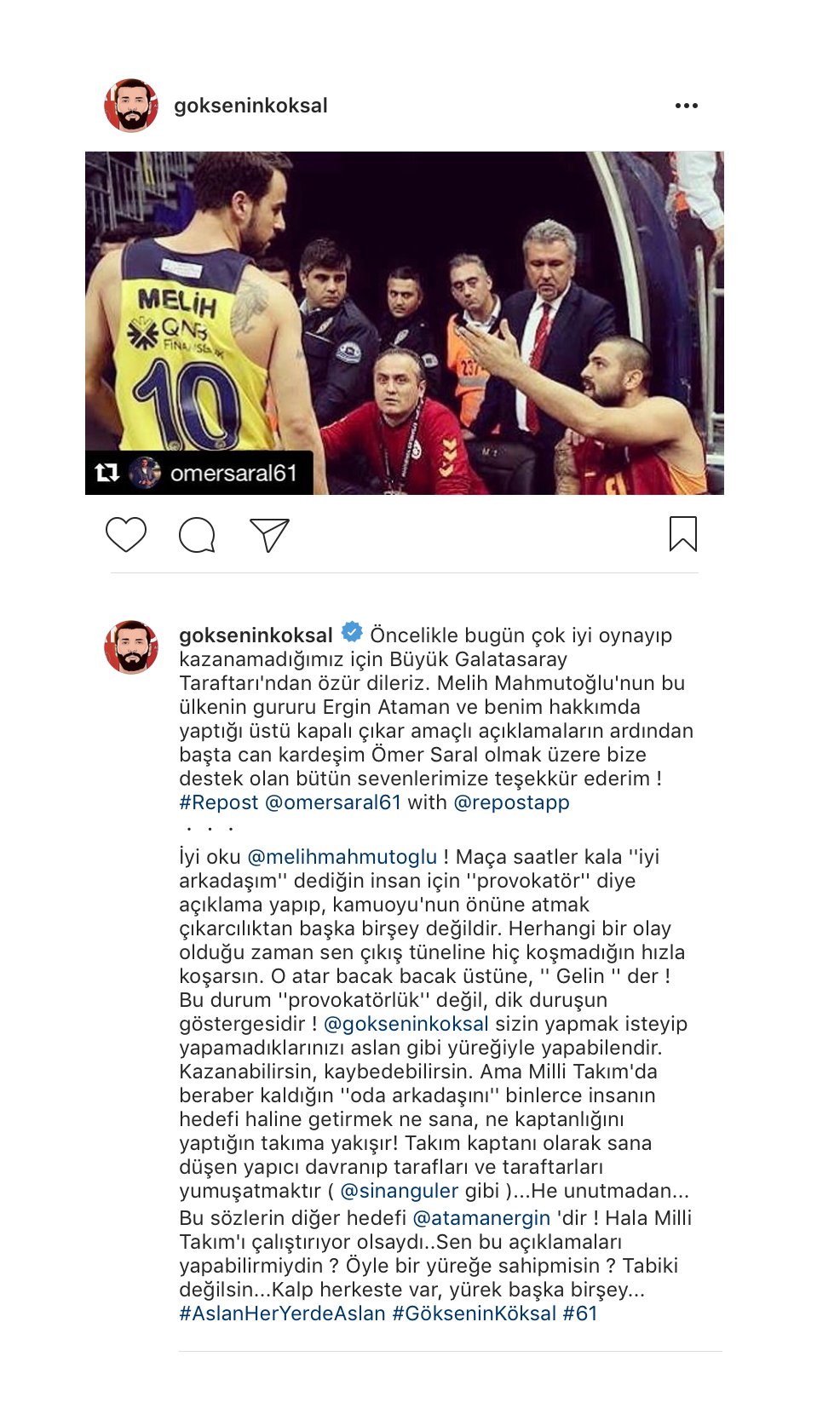 Galatasaray Odeabank'ın tecrübeli ismi Göksenin Köksal, Fenerbahçe derbisinin ardından Melih Mahmutoğlu'nun açıklamalarıyla ilgili bir paylaşımda bulundu.