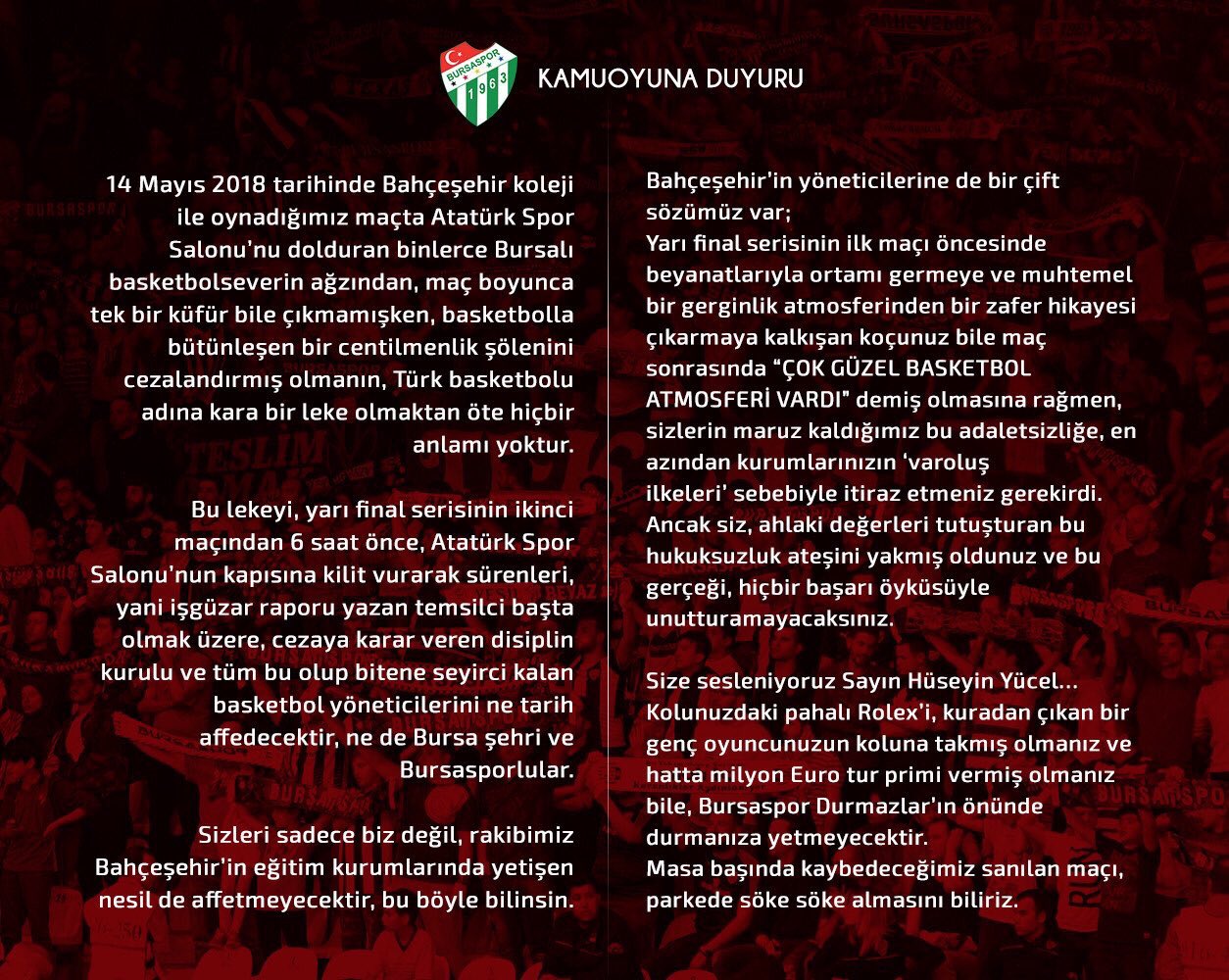 Bursaspor Durmazlar, Bahçeşehir Koleji'yle oynayacağı maçtaki taraftar yasağıyla ilgili açıklama yayınladı.