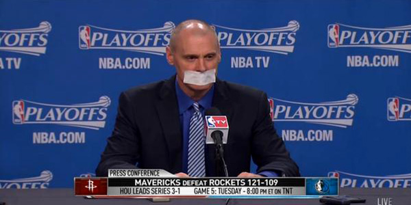 NBA'de Dallas Mavericks'in Play-Off serisinin 4. maçında Houston Rockets'ı yendiği maçın ardından Dallas koçu Rick Carlisle kameraların karşısına geçti. Carlisle, basın mensuplarının hakem kararları hakkındaki sorusuna çok ilginç bir karşılık verdi. Carlisle, çok sert geçen seride hakemlerin Houston'a avantaj sağladığı hakkındaki iddialara yanında getirdiği bandı ağzına yapıştırarak yanıt verdi. Carlisle böylece hem hakemler hakkında konuşarak ceza almaktan kurtuldu hem de kararlar hakkında ne düşündüğünü çok net bir şekilde ortaya koydu. Seride 3-1 önde bulunan Houston, evinde oynayacağı 4. maçı kazanması halinde Batı Konferansı Play-Off’larında yarı finale yükselecek.