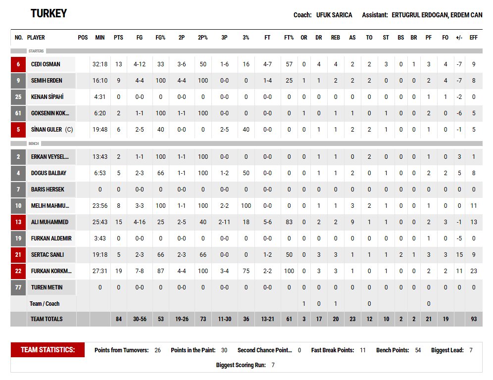 11/30 ile dışarıdan, 19/26 ile içeriden isabet bulan ribaundlarda 32-20 geri düşse de rakibine 23 top kaybı yaptırdı. Furkan Korkmaz 4/4 iki sayı 3/4 üçlükle 19 sayı 3 ribaundla oynarken Cedi Osman 13 sayı 4 ribaund 2 asist 3 top çalma, Bobby Dixon 15 sayı (2/11 üç sayı) 2 ribaund 9 asist ile oynadı.