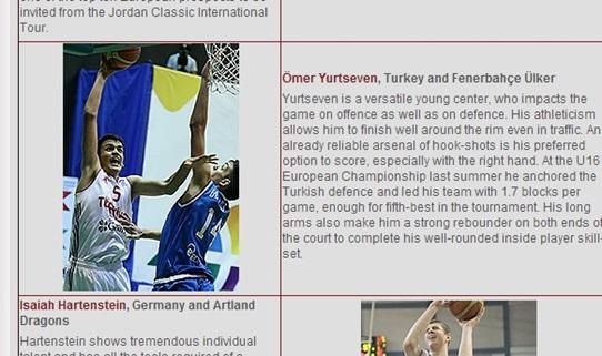 Letonya'da bugün başlayacak Avrupa Yıldızlar Şampiyonası öncesinde FIBA, Milli Takım oyuncularımızdan Ömer Faruk Yurtseven'e övgüde bulundu. FIBA, izlenmesi gereken 5 oyuncu arasında Fenerbahçe Ülker'de forma giyen Ömer Faruk Yurtseven'e yer verip, “Atletizmi ile kalabalık içinde dahi çember altında bitirebiliyor. Özellikle sağ eliyle çengel atışları kullanıyor. Geçen yıl U16 Şampiyonası'nda 1.7 blok ortalaması yakalamış, uzun kolları ile ribaundları toplamıştı” yorumunda bulundu.