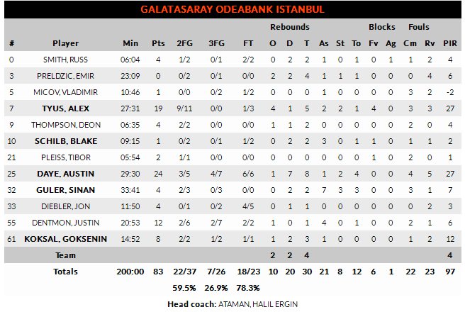 Galatasaray Odeabank'ta Austin Daye 24 sayı-8 ribaund, alex Tyus 19 sayı-5 ribaund-3 blok ve Justin Dentmon 12 sayıyla oynadı.