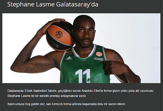 Kulüpten yapılan açıklamada, “Galatasaray Erkek Basketbol Takımı, geçtiğimiz sezon Anadolu Efes'te forma giyen yıldız pota altı oyuncusu Stephane Lasme ile bir senelik prensip anlaşmasına vardı. Sporcumuza hoş geldin der, sarı kırmızılı forma altında başarılarla dolu bir sezon dileriz” denildi.