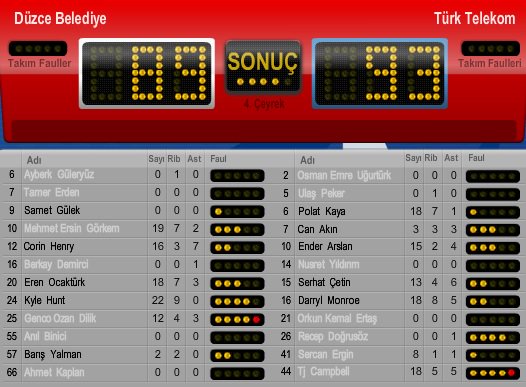 Düzce Belediyesi'ni 93-89 yenen Türk Telekom'da Darryl Monroe, TJ Campbell ve Polat Kaya 18'er sayı ürettiler. 30 dakika sahada kalan Ender Arslan 15 sayı 2 ribaund 4 asist ile mücadele etti.