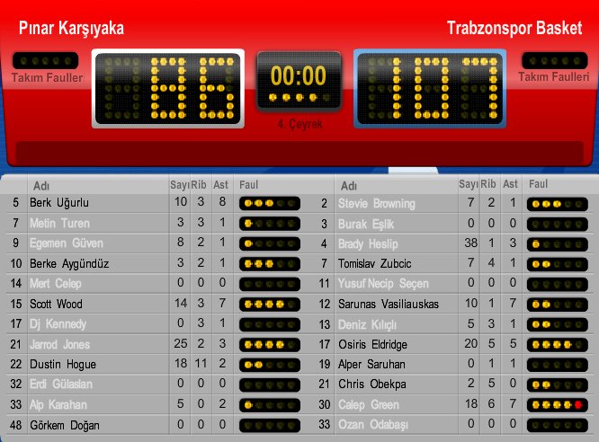 Pınar Karşıyaka'da Jarrod Jones 25 sayı 2 ribaund 3 asist, Dustin Hogue 18 sayı 11 ribaundla oynarken Berk Uğurlu'nun 10 sayı 8 asisti dikkat çekti.