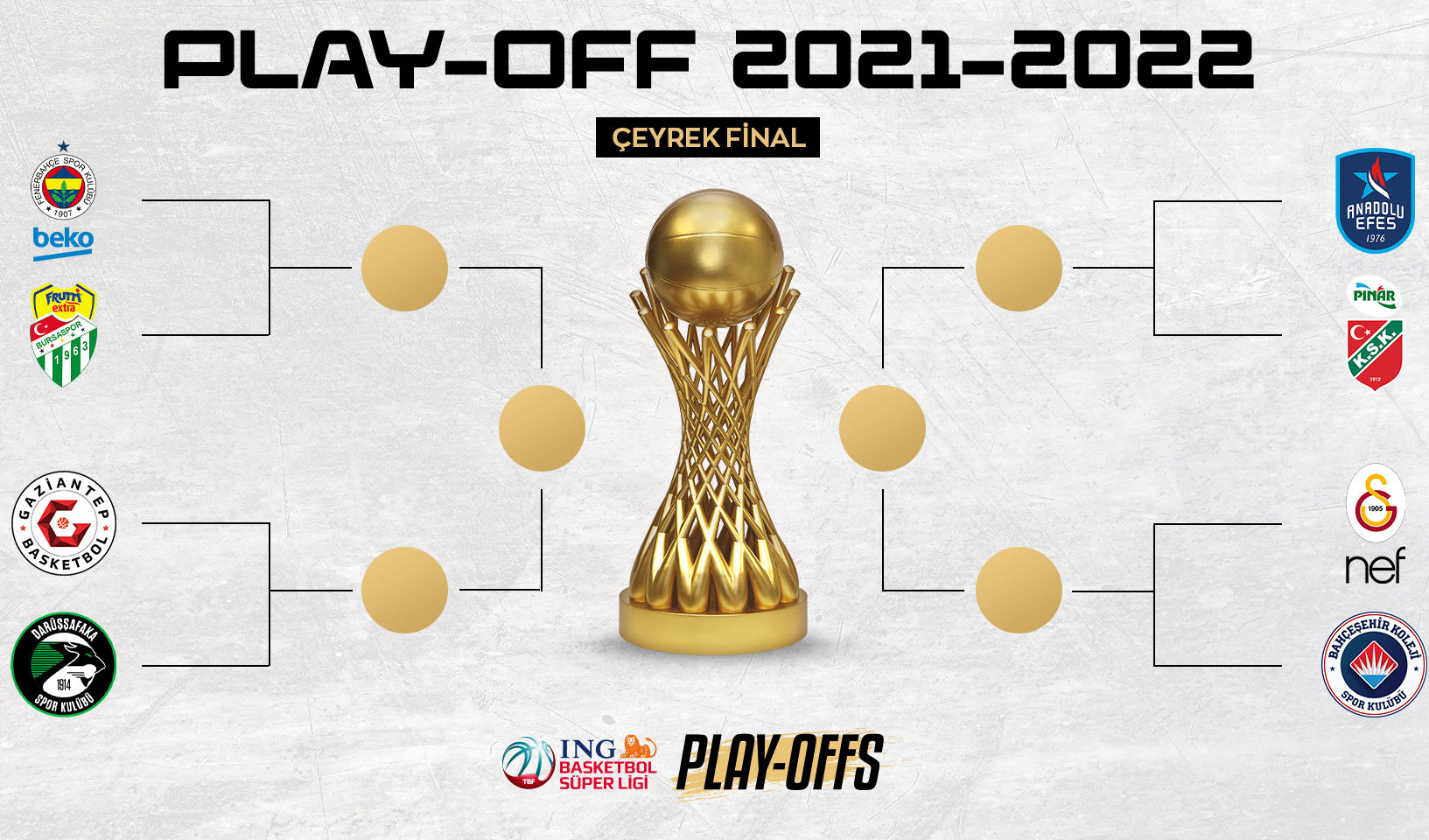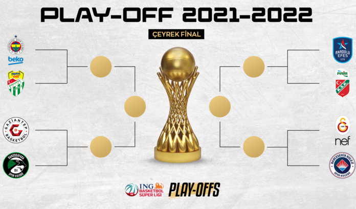 ING Basketbol Süper Ligi'nin play-off çeyrek finalinde Fenerbahçe Beko-Frutti Extra Bursaspor, Anadolu Efes-Pınar Karşıyaka, Galatasaray Nef-Bahçeşehir Koleji, Gaziantep Basketbol-Darüşşafaka eşleşmeleri oluştu.