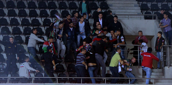 “AK Partililer dışarı diye bağıran” Karşıyakalı taraftarlar, AK Partilerin bulunduğu yöne doğru hareketlenerek “Mustafa Kemal'in askerleriyiz” sloganları attı. İki taraf pota arkası tribününde kavga etti. Kavga, yaşanan olay çevik kuvvet ve Ankara Emniyeti Spor Güvenlik Şube Müdürlüğü ekiplerinin araya girmesiyle son buldu.