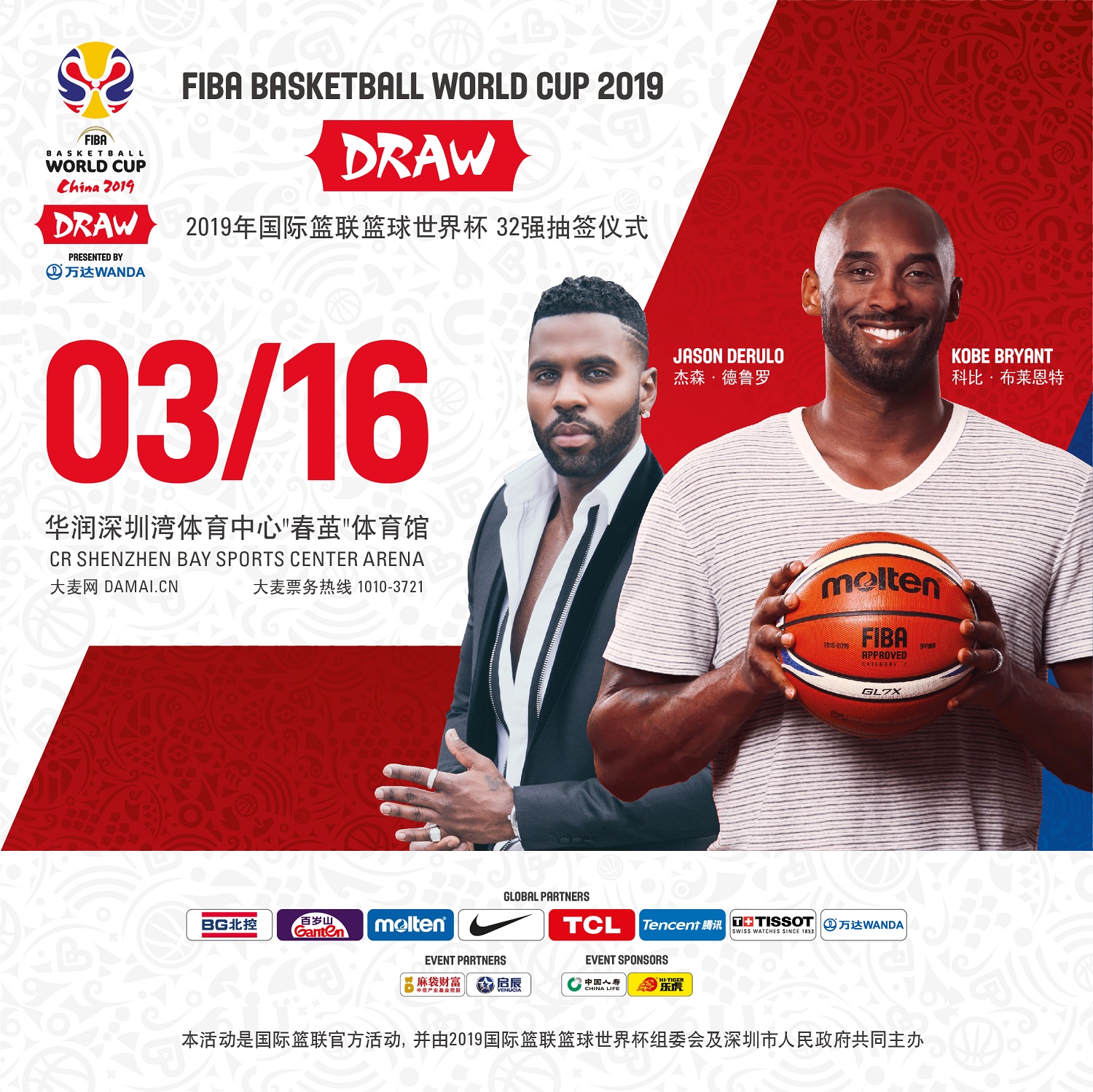 Geçen sene Ekim ayında FIBA 2019 Basketbol Dünya Kupası’nın global elçisi olarak tanıtılan Kobe Bryant kura çekimini gerçekleştirirken, Jason Derulo etkinlik boyunca en popüler şarkılarını söyleyecek. Etkinlikte, ayrıca, Dünya Kupası’nın ilk global elçisi olarak tanıtılan Çin’in en büyük basketbol efsanesi Yao Ming de yer alacak. Bugüne kadarki en büyük FIBA Dünya Kupasına ev sahipliği yapacak Çin’in belirlenen sekiz şehrinden biri olan Shenzhen’de gerçekleşecek törenler bir hafta sürecek. Shenzhen Bay Arena'da gerçekleşecek FIBA Basketbol Dünya Kupası 2019’un kura çekimi ilk defa halka açık olarak düzenlenecek.