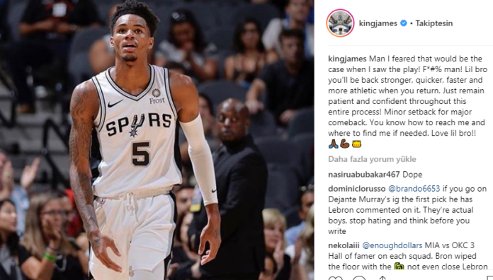 Instagram üzeriden ağır sakatlık yaşayan 22 yaşındaki genç oyun kurucuya destek veren LeBron, “Bana ne zaman ve nasıl ulaşabileceğini biliyorsun” diyerek Murray'e moral verdi.