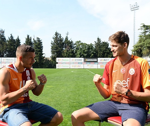Galatasaray Odeabank-CSKA Moskova maçı öncesi Galatasaray futbol takımının Alman yıldızı Lukas Podolski ile basketbol takımının yeni transferi Tibor Pleiss, Florya’da buluştu.