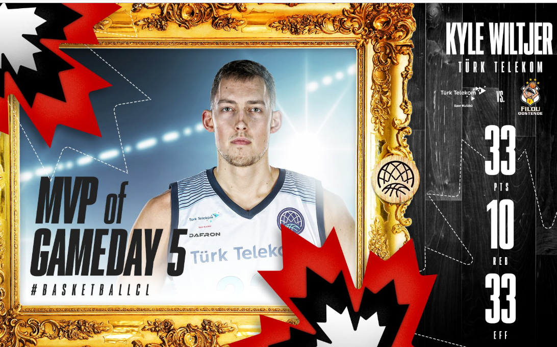 Basketbol Şampiyonlar Ligi'nin 5. haftasında Oostende'ye karşı 33 sayı 10 ribaund ile 33 verimlilik puanı alan Wiltjer haftanın en değerlisi oldu.